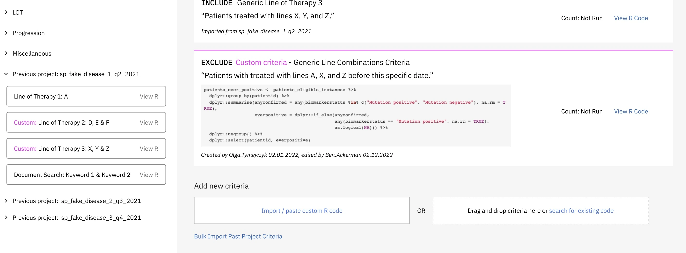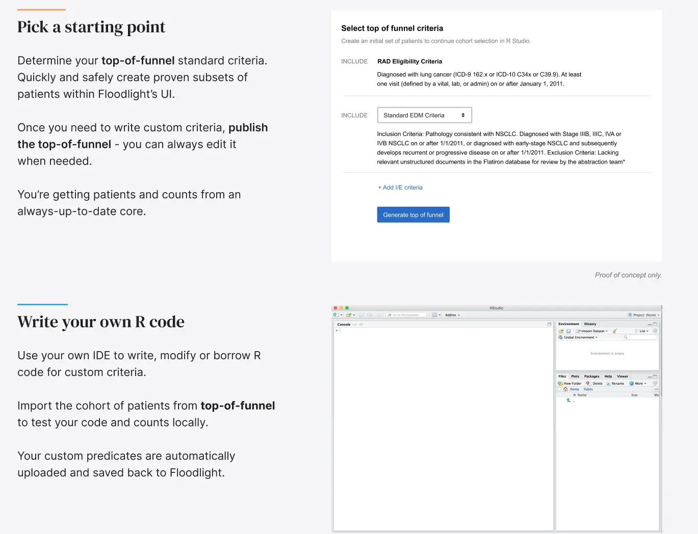We originally wanted cohort selection to be more tightly coupled with RS R work with more in-app editing. But projects at Flatiron were evolving faster than the tech could support it; as we were building Cohort Selection, the eventual end user kept changing at a BU level. While we anchored to RS first, my designs reflect the uncertainty of full ownership. It was possible setup of standard and custom variables would still be split up, and it was important to visually create separate running spaces for both. The new Hybrid Cohort Selection was designed for change, with an emphasis on quickly spinning up projects, and pulling functional R code from S3 regardless of its original source.