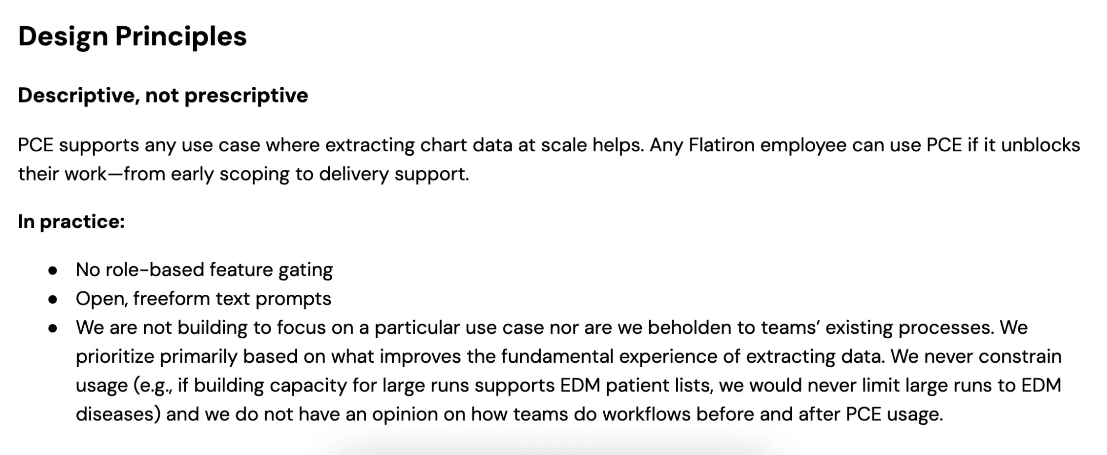 - Designing for Fifth Run Value over First Time Impressions: Testing for satisfaction and usability within PCE did not give us useful feedback. Our users were brand new to LLMs and did not know what was possible. While I typically adopt a "beginner mindset" during research I instead had to become a PCE expert, holding office hours and 1:1 coaching to push users to experiment. We measured our success on retention rather than ease of use, following up on PCE abandons, and noting but not prirotizing user confusion. When we saw users push PCE beyond what current abstraction capacities are (in type of data + size) we knew we had succeeded.